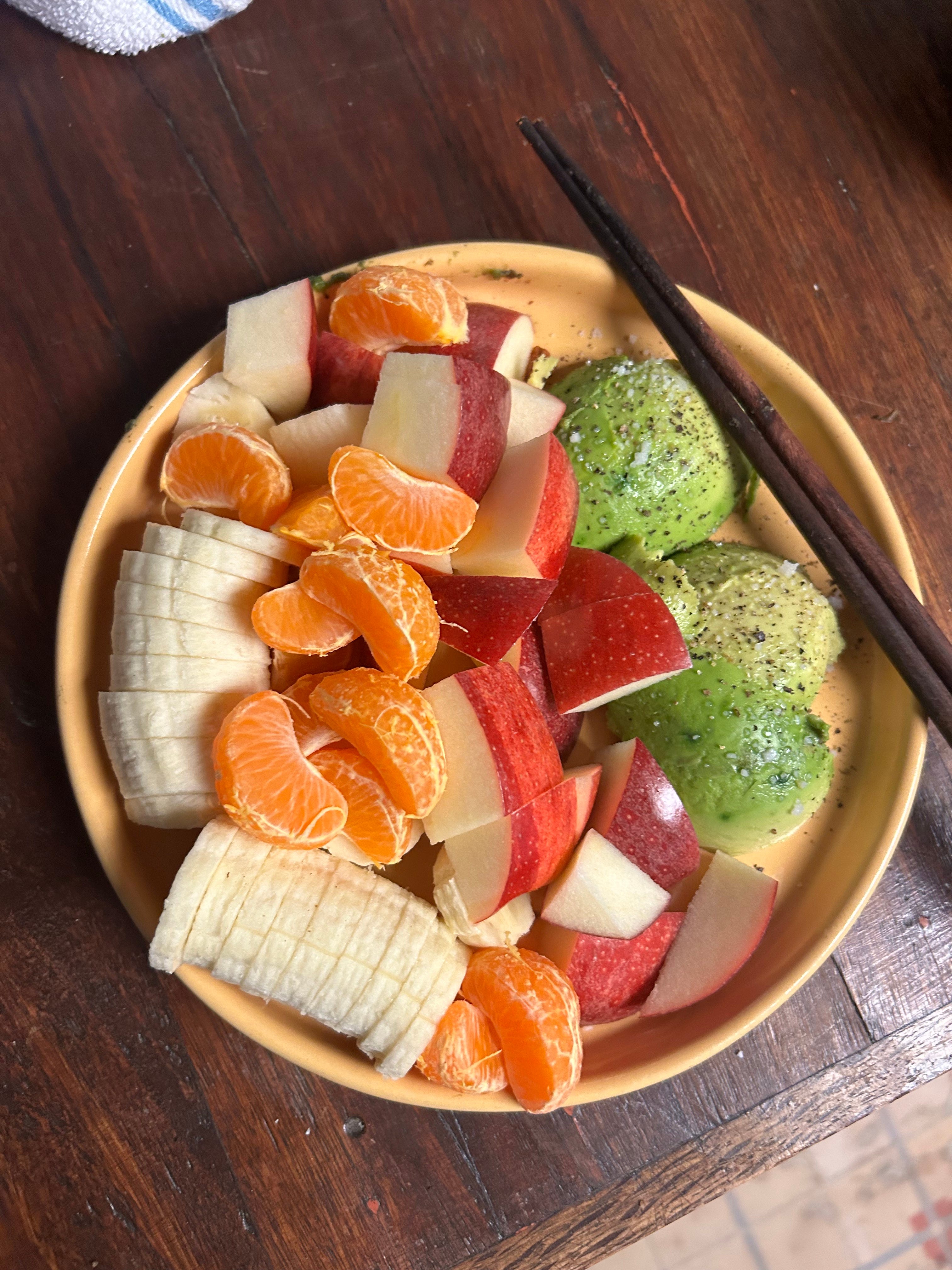 My healthy snack recipe for the week has to be: a banana, apple, mandarine, and avocado with salt and pepper plate. Pick with chop sticks or fingers, but the sticks are always fun. When I’m at the computer its the best hack. I guess I could use a fork 😕.